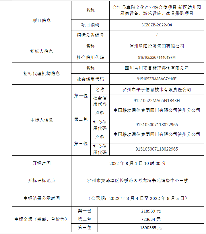 合江縣阜陽文化產(chǎn)業(yè)綜合體項目-新區(qū)幼兒園廚房設(shè)備、游樂設(shè)施、家具采購項目公開招標(biāo)中標(biāo)結(jié)果公告