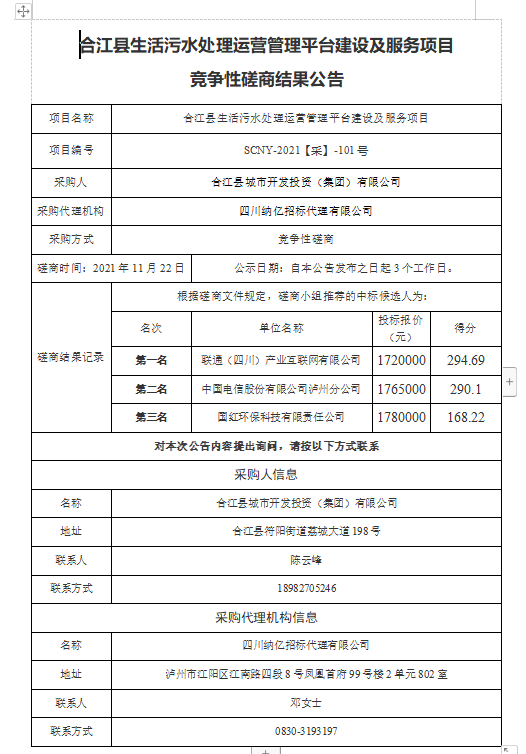 合江縣生活污水處理運營管理平臺建設(shè)及服務(wù)項目競爭性磋商結(jié)果公告