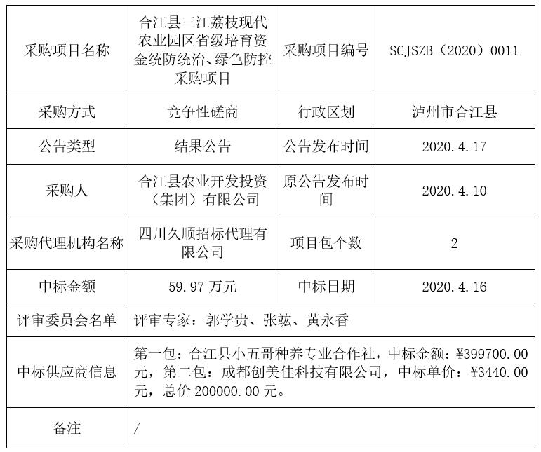 合江縣三江荔枝現代農業(yè)園區(qū)省級培育資金統(tǒng)防統(tǒng)治、綠色防控采購項目競爭性磋商結果公告