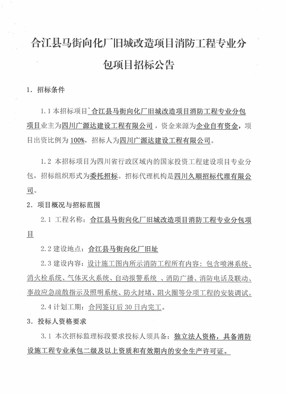 合江縣馬街向化廠舊城改造項(xiàng)目消防工程專(zhuān)業(yè)分包項(xiàng)目招標(biāo)公告