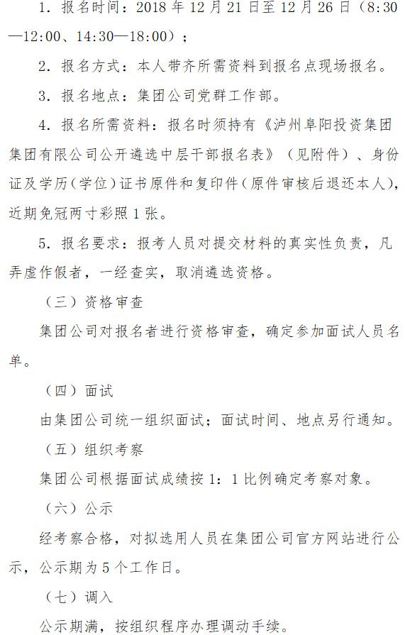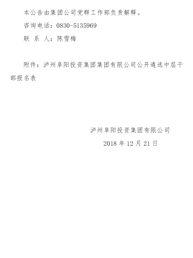 瀘州阜陽投資集團集團有限公司關(guān)于面向全集團公開遴選中層干部的公告